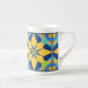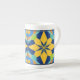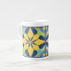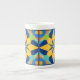 Abstrakt illustration med en symmetrisk färgrik design med geometriska former och livfulla nyanser av rött, gult och blått, som skapar en dynamisk visuell estetik.