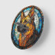 Ett fantastiskt mosaikkonstverk som föreställer ett verklighetstroget hundporträtt i levande färger, vackert inramat av intrikata mönster i blå nyanser. Denna konst uttrycker kreativitet, hantverk och kärlek till djur.