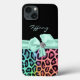 Trendig iPhone-fodral i svart med ett färggrant jaguartryck med fläckar på toppen och botten. Grafik av ett mintgrönt band och rosett med en diamantaccent pryder mitten av fodralet. Anpassa den mintgröna texten för dig själv eller som en perfekt presentidé.