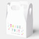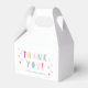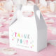 Konfettiförrådspresentlådor för barnkalas är perfekta för födelsedagar och examina. Med regnbågsfärgade TACK konst och anpassningsbart typnamn är dessa lådor ett ljust, djärvt och modernt sätt att paketera presenter till gästerna att ta med hem som ett tack. Vänligen se våra koordinerande artiklar i samlingen Confetti bash av Stacey Meacham. Det finns många kompletterande tillbehör och färgvägar för denna inbjudan-svit som gör den till ett perfekt val för pojkar eller flickor. Leta efter stämplar, adressetiketter, kuvert, tack-kort och mer.