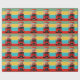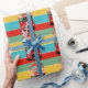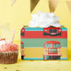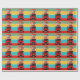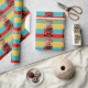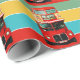 Slå in papper (gåvasjal) som använder starka musikband av färg och ett foto av den iconic dubbeldäckarebussen av London, fotograferade i den mitt- 90-tal.