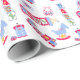 Färgrikt rött, vit, blått, gult och gröntpojke baby shower som slår in papper. Gulliga diagram av flaskor, haklappar som vaggar hästen, barnkläder, pladdrar, leksaktåg och den läs- BABYEN för grafisk text.