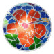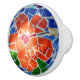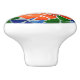 Denna ljusa blomkeramiska knopp har en röd blomma mot blå bakgrund gjord av färgrika mosaikplattor fläckade i solljus och skugga. Det här är en av flera samordnade keramiska knoppar med design som visar en mosaik karp damm.