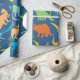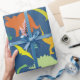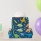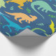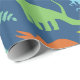 Färgrikt Dinosaursilhouettemönster. Tyrannosaurus Rex, titanosaurs, Triceratop, rovfåglar, Ankylosaurs, Dino-Fåglar, Stegosaurus, Apatosaurus, Pteranodon och mer i ett färgrikt mönster i blåttbakgrund och dinosaurs i grönt, blått, gult och orange.