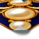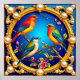 En vy av tre livfullt färgade fåglar som sitter på grenar, inneslutna i en utsökt dekorerad gyllene ram prydd med pärlor och mot en livfull blå bakgrund. Elegans och natur blandas vackert.