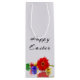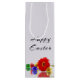 Att presentera för glad påskillustration som är färgrikt, omkullkastar slågen in chokladpåskägg och en röd gerberablomma på en ljus vit-grå färg bakgrund.