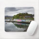 Fotomousepad med de färgrika fiskehamnhusen av den Portree townen, med reflexion i lugnt vatten av havet på islen av Skye i Skottland, UK.