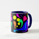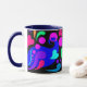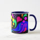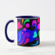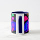 Första av 4 muggar med kulöra handtag och insida. Designen på denna har hjärtor, bubblar och virvlar runt i djärvt, sötfärger på en svart panel. Handtaget och insidan är marinblåa.