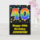 Bekläda av denna spännande, roliga och vibrerande design för födelsedaghälsningkortet presenterar ett färgrikt stjärnamönster, tillsammans med numrera "40" ha den mångfärgade regnbågen inspirerat spectrumlutningmönster, på en svart kulör bakgrund. Bekläda presenterar också ett födelsedaghälsningmeddelande, däribland ett beställnings- mottagareare namn. Insidan presenterar ett skräddarsy födelsedaghälsningmeddelande eller kunde kanske göras klar, och tom vänstersida, om ett meddelande är att vara skriftligt by, räcker i stället. En något liknande för anpassadefödelsedagkort denna styrka är en roligt långt som överför födelsedagönskemål till någon som firar deras fyrtionde födelsedag. [~Z0000348]