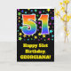 Bekläda av denna spännande, roliga och vibrerande design för födelsedaghälsningkortet presenterar det färgrika inspirerat mönster för stjärna fält, tillsammans med numrera "51" ha ett mångfärgat mönster för lutning för regnbågespectrumnågot liknande, på en svart kulör bakgrund. Bekläda presenterar också ett födelsedaghälsningmeddelande, däribland ett skräddarsy mottagareare namn. Insidan presenterar ett meddelande för anpassadefödelsedaghälsning eller kunde kanske göras klar, och tom vänstersida, om ett meddelande är att vara skriftligt by, räcker i stället. En födelsedagkortnågot liknande denna styrka är en roligt långt som överför födelsedagönskemål till någon som firar deras första födelsedag femtio. [~Z0000348]