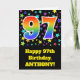 Bekläda av denna spännande, roliga och vibrerande design för födelsedaghälsningkortet presenterar ett färgrikt mönster av stjärnan formar, tillsammans med numrera "97" presentera ett mångfärgat mönster för lutning för regnbågespectrumnågot liknande, på en svart kulör bakgrund. Bekläda presenterar också ett födelsedaghälsningmeddelande, däribland ett skräddarsy mottagareare namn. Insidan presenterar ett skräddarsy födelsedaghälsningmeddelande eller kunde kanske göras klar, och tom vänstersida, om ett meddelande är att vara skriftligt by, räcker i stället. En något liknande för personligfödelsedagkort denna styrka är en roligt långt som bekräftar somebodys den sjunde födelsedagen för nittio. [~Z0000348]