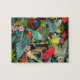 Original- konstmålning av färgrika papegojor från undulat och pionus till hövdade parakiter för plommonet och rosellaen av konstnären Carolyn McFann på ett kvalitets- pussel för papegoja fläktar.