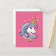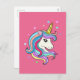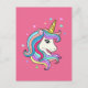 En glad enhörning i pastel färg på en ljus rosa bakgrund.