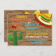 Roligt pars möhippa är gjord i ett färgstarkt mexikanskt tema, med en brunt träkornbakgrund och grafik av en tecknad kaktus med en sombrero och en dekorativ tecknad sombrero på toppen. Text med flera färgader är fullt anpassade och redo att anpassa för evenemanget.