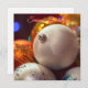 En närbild visar en samling julprydnader. Utsmyckningarna varierar i färg och design, inklusive vitt, guld och rött. Vissa är dekorerade med glitter och mönster. Bakgrunden är suddig, färglös ljus, vilket ökar den festliga atmosfären. Bilden väcker en känsla av värme och helgdag.