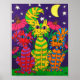 Dekorera väggarna i stil med den här unika, färgstarka folkkonsten poster. I denna upplyftande, vismliknande konst är dessa tre ljusa färgad tabby katt på gräset framför ett plåster av exotiska rosa blommor under ett halvmåne måne och en lila stjärna fylld nattetid himlar.