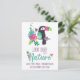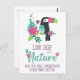 Det här vykortet har ett vackert tropiskt tryck i levande färg, med en söt tecknad som är tukant, färgstark tropisk löv och blommor, och en liten rosa fågel. I texten från Einstein står det: "Titta djupare in i naturen så förstår du allt bättre", i lila och ljusblå typsnitt.
