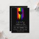 Charming 2 på 1 lgbt bröllopsinbjudan med regnbåge flagga som dras med streck och som är försedd med ett svart hjärta mot en svart bakgrund. Lägg dina uppgifter om bröllop till baksidan under ett färg fyllt regnbåge.