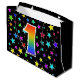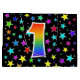 Den här spännande, roligt- och vibranta presentsäcksdesignen har flera färgstarka stjärnformer, tillsammans med siffran "1" med ett flerfärgat regnbågsinspirerat spektrumövertonat mönster, på en svart färgad. En presentpåse som denna kan vara ett sätt att på roligten slå in presenter eller gåvor som ges till någons första födelsedag, eller kanske för ett pars första bröllop-årsdag, eller något annat första evenemang. [~Z0000347]