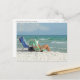 En vattenfärgsmålning med vykort som visar en kvinna som läser bok i en strandstol när vågar rullar in på stranden.