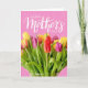 Det här är ett Mors dag-kort med en närbild. Fotografisk bild av ett vas med färgstarka tulpaner som ställs in mot en rosa bakgrund. Tulpanerna går ut från ram till designens lämnat, höger och grund. Ovanför tulpanerna står texten "LYCKLIG Mors dag". Design av Natalie Kinnear