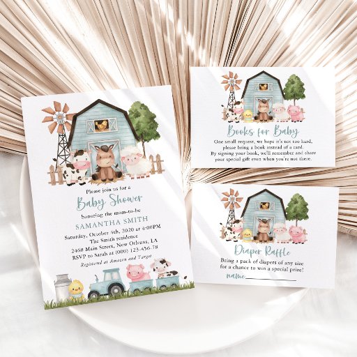 Add a personal touch to your baby shower celebration with these stylish and memorable party items! Design features farm animals (cow, horse, sheep, pig, rooster, chicken), blue barn and blue tractor on white background.