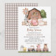 Invite friends and family in style and set the tone for your special day with this charming baby shower invitation. Design features farm animals (cow, horse, sheep, pig, rooster, chicken), brown barn and brown tractor on white background.