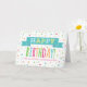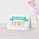 Födelsedagskort för barndotter med färgad konfetti, handskriven stil-text och vintage med ljusblå, orange, gult, grönt och shock rosa.