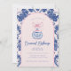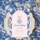 Denna inbjudan till julfesten har en liten årtusendesformgivning med en rosa prydnad med kinesisk design med en blå och rosa som fäste gräns runt kant. Framsidan och baksidan har ett samordnande fuktmönster.