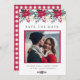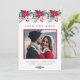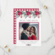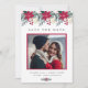 Ett rött ram omger förlovningens foto. Tre stora röda poinsettiska blommor som är inkapslade i vintergröna bildar ett bondhus stil blommigt gräns. Samma motiv för blommigten utgör en mindre posey grund på datumkortet. Namn, datum och plats för bröllop är skrivna i en mjuk grått-text. Bakgrunden till den röda plattan på baksidan av den sparade datuminbjudan fortsätter med jordbruksföretagets design stil.