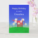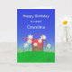 Födelsedagskort för farmor med min utformning av en ljusstark blå himmel, ljusröd vattenburk på grönt gräs och söt daisy.