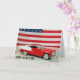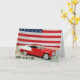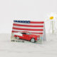 Gamla röda och vita 1955 Chevy-bilen på en väg karta med amerikansk flagga-bakgrund för Fars dag. Text kan redigeras.