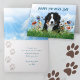 Fars dag-kort med Bernese Mountain hund på framsidan. Vågrät, vikt kort med meddelande inuti. Ge till pappa från hund eller från familjen. Hund ljuger bland vilda blommor och grönt med blå himmel som bakgrund. mörk blått står texten "Lycklig Fars dag" på framsidan. Inkludera ett personligt meddelande i ett handskrivet teckensnitt. Tass avtryck står bredvid formuleringen. Kortets baksida har mönster i tass avtryck. Välj utskrivet kort eller hämtningsversion.