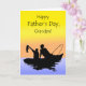 Fars dag-hälsningskort för morfar/morfar. En silhuett av ett farfar- och morsonfiske. Pojken håller upp en stor fisk för att visa sin morfar som lutar sig in för en närmare titt. Bakgrunden har en varm färgad soluppgång av gult och orange över skuggor av blått vatten. Bild och versell copyright © Shoaff Ballanger Studios.