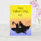 Fars daghälsningkort för en far/en pappa. En silhouette av ett far- och sonfiske. Sonen är hållande övre en stor fisk som visar hans pappa som lutar in för en mer nära look. Bakgrund har en varm kulör soluppgång av gult, och orangen över skuggar av blåttvatten. Avbilda, och versen tar copyrightt på ©Shoaff Ballanger studior.
