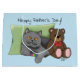 Cute grått-katt med leksak och nalle som önskar sin katt pappa vid Lycklig Fars dag.