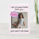 Du kan anpassa detta Morsdagskort med dina foton. Den rosa bakgrunden, i kombination med ett humoristiskt meddelande i en barns oskyldiga ton, skapar en varm och tröstande atmosfär.