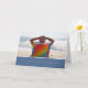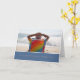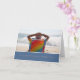 Fars dag-kortet för Son innehåller ett foto av en grått-ledd man som relaxar i en färgstark regnbågsstol på en havsstrand som tittar på den kraschar vinkarare.