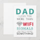 Visa Pappa precis hur mycket han betyder för dig med vårt unika Farsdag WiFi-kort! Med den roliga och relaterbara texten "Pappa, jag älskar dig mer än WiFi-signaler - och det säger en del!" är detta kort perfekt för teknikintresserade pappor och de som uppskattar ett gott skratt. Designat med en modern touch och en stilren layout är det ett hjärtligt sätt att uttrycka din kärlek och uppskattning. Gör denna Farsdag oförglömlig med ett kort som talar volymer om din kontakt och kärlek. Perfekt för alla pappor som värdesätter både humor och hjärtliga känslor!