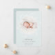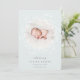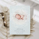 Elegantens födelsemärkning i mjuk färg har ett runt nyfött foto omgivet av en andedräkt av vitt botaniskt grenar och löv, med "införande [Namn]" vid grund i chic grått-bokstäver. Anpassa till baby födelsedatum och födelsestatus under. Lägg till ett personligt meddelande på baksidan tillsammans med ett ytterligare foto.