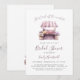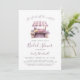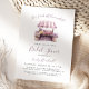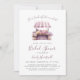 Denna bröllopsfestinbjudan har en akvarellmålning av en blommavstånd på en bondemarknad i pastellvioletta nyanser. Orden "Hon är ny från marknaden!" och "Bröllopsfest" visas i elegant violett handskriven text. Lägg till namnet på den blivande mamman i violett handstil och den återstående informationen i kolgrå sans serif-teckensnitt. Baksidan av kortet har en mindre version av blommavståndet nära botten.