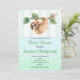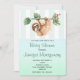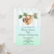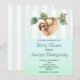 En inbjudan till babydusch med en fin lutning uppifrån och ned från träd gren. Träd gren är dekorerat med tropiska löv och bär. Ställ in på en ljust grönt och vit strimlad bakgrund.