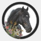 Svart häftdetiketter. Wildblommor växer nära huvudet på en vacker svart häst. Han har lite vitt på ansikte, men allt annat är svart. Dekalen är vit med svart och grått gräns. Rundklistermärken kom i två storlekar.