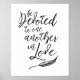 Kalligrafi, typografi i svart brev i elegant med finare-tecken och alternativ och prydnadsbyten lyder: "Händas till varandra i Kärlek." Design accentueras med handritad löv. Skripturen är från romer 12:10. "Var dedicerad till varandra i Kärlek."