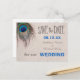 Här är ett tilltalande och trendig Spara Bröllop-postkortet för datum som har en enda färglös påfågelfjäder. Ludden placeras i det övre lämnat hörnet. Din anpassningsbar är i grått och matchar blå. Bilden och texten placeras på en grått med tryckt ljusbakgrund som kompletterar färg i fjädrarna. Underbart för alla säsonger! Baksidan har en extra-text fält, om det behövs.