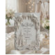 This design features a highly detailed, monochromatic illustration evocative of a grand gothic cathedral. The layout is framed by an ornate architectural border with baroque scrollwork and cascading floral garlands in soft shades of ivory, cream, and beige. Two symmetrical doves rest atop a stone balustrade arch, creating a sense of peace and symmetry. The text is presented in a mix of elegant flowing calligraphy and refined serif typography. This is a flat printed image with a Faux 3D Embossed Relief effect, not actual raised paper or pressed material.