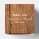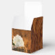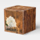 Anpassa avslappnaden ännu i klass Faux Barn Wood, White Hydrangea och Barn Wood Wedding Favor Box med namnen på briden och brudgummen och ceremonin i giftermål och fyll med party favors eller små gåvor till gästerna på er informella lantgård, på gården i stil eller i giftermål. I dessa land-chic-anpassningsbar är det rotiska temat för faux-plåtsboxar ett digitalt färgfoto av en vit blommar av vattenblomma och snöre-trimmad linnäsduk på en häckbale med en vättad brunlingbakgrund.