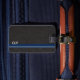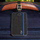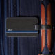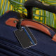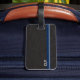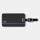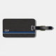 Ett klassiskt stil med svart läderbakgrund och ett enkelt monogram med blå linje och mindre grått rand. För den person som vill ha ett enkelt utseende men som tycker om ett enkelt sätt att identifiera sitt bagage utan att avslöja all information. Ursprunglig design av Night Uggla Menagerie, 2023.