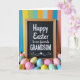This greeting card features a festive scene centered on a rectangular black message panel with a natural wood-toned frame. Across the middle, the text reads “Happy Easter to our favorite GRANDSON,” with “Happy Easter to our favorite” in white and “GRANDSON” in larger, all-cap white lettering for extra emphasis 🐰. At the base of the frame, a generous pile of egg-shaped decorations gathers close together, like they’ve been arranged with extra care for someone special. The eggs are colored in soft pink, yellow, sky blue, and mint green, and several show stripes and zigzag patterns that add a sweet, friendly energy 🐇. Behind everything, tall vertical stripes in deep blue, sunny yellow, green, light blue, orange, and coral set a lively backdrop that makes the framed message stand out. The lighting is even and gentle, letting the wood frame look warm and the colors feel fresh without harsh shadows. The striped background runs from top to bottom, while the patterned eggs cluster tightly along the lower edge of the framed sign.