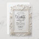 Set the tone for a timeless fairytale union with this ornate, vintage-inspired design. Perfect for couples seeking traditional luxury and classic romance.This design features a sophisticated digital rendering of a 3D ornate baroque frame, creating a sculpted look with symmetrical scrollwork and leaf flourishes. At the center, two paired swans form a delicate heart crest surrounded by decorative roses, all rendered in soft ivory and creamy off-white tones with subtle light gray shading to mimic depth. The text is presented in an elegant calligraphy script header paired with traditional charcoal serif typography for a formal finish.This is a flat printed image with a printed faux relief effect, not actual raised material or embossing.